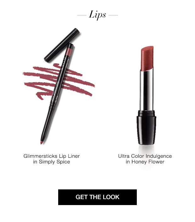 Lauren begins the everyday lip look with Glimmersticks lip liner in Simply Spice, following the edge of the lip in small strokes and shading the outer corner for a fuller pout. Ultra Color Indulgence lipstick in Honeyflower blends into the liner and creates the perfect lip shade for everyday wear.