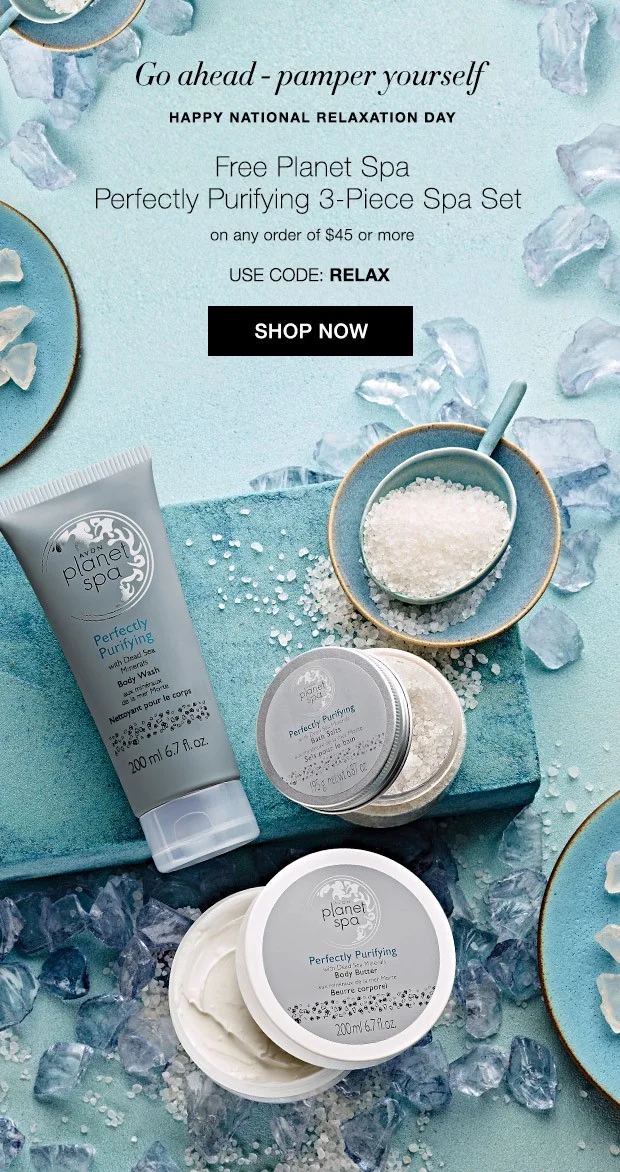 Happy National Relaxation Day! EXPIRES MIDNIGHT ET, 08/15/16. WHILE SUPPLIES LAST. MAIL DELIVERY ONLY.Avon reserves the right to substitute any free item offered with an item of equal or greater value. Limit one per order Marco PaniaguaAugust 15, 20161 Comment Facebook0 Twitter LinkedIn0 Reddit Tumblr 0 Likes